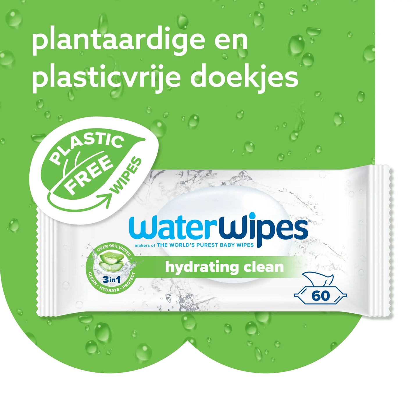 WaterWipes Hydrating Clean wipes contain more than 99% water and naturally sourced aloe vera. The wipes have a 3-in-1 effect: