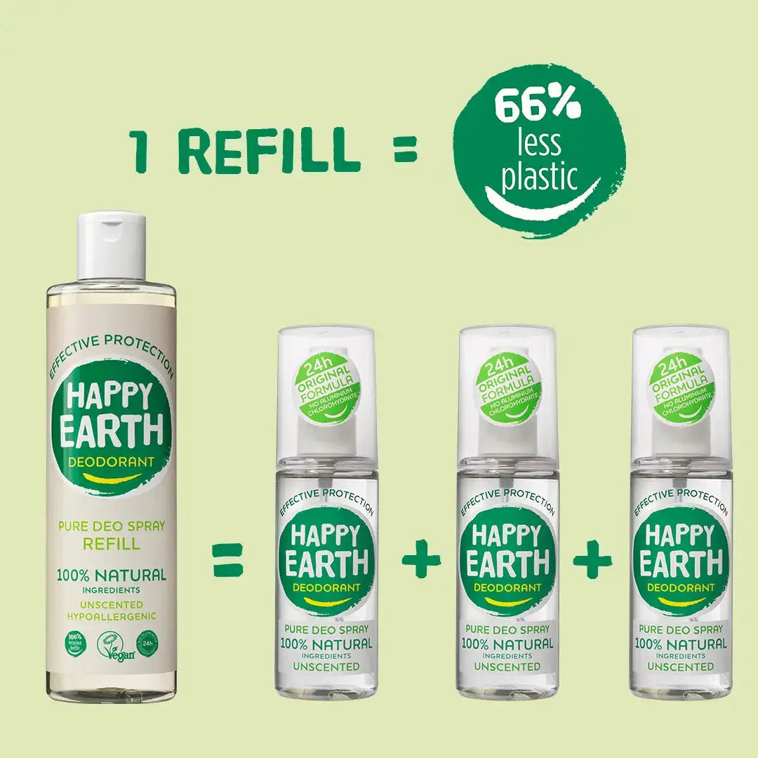 Verminder plastic afval door jouw Happy Earth Deodorant Sprayfles tot wel 3 keer na te vullen en verbruik 66% minder plastic. Happy Earth Pure Deodorant Spray Refill Unscented is een 100% natuurlijke, vegan navulverpakking voor deodorant die gemaakt is van ingrediënten waar jouw huid én de aarde blij van worden. Deze deodorant is aluminiumvrij en bevat geen alcohol, parabenen of drijfgassen. Met trots dragen wij dan ook de keurmerken van NATRUE en Vegan Society. Met deze deodorant zorg je goed voor jezelf en voor onze aarde!