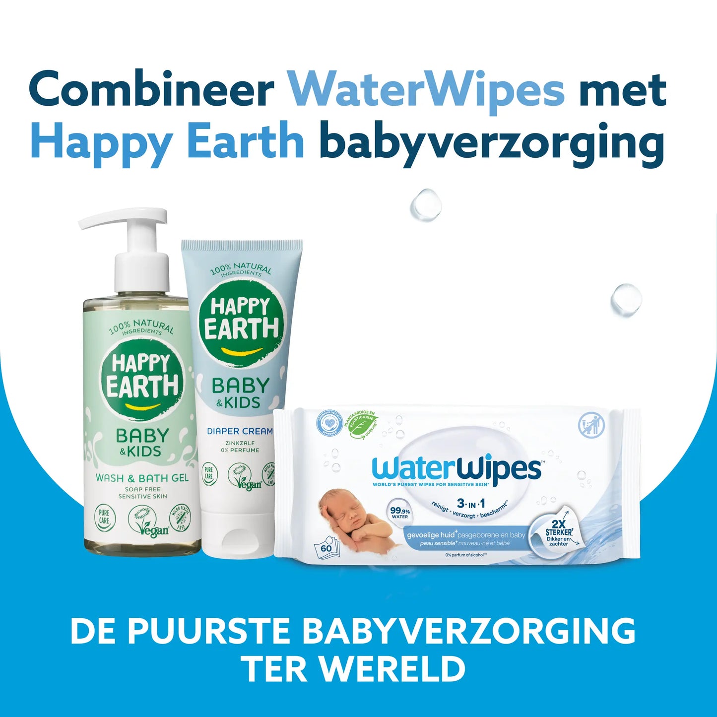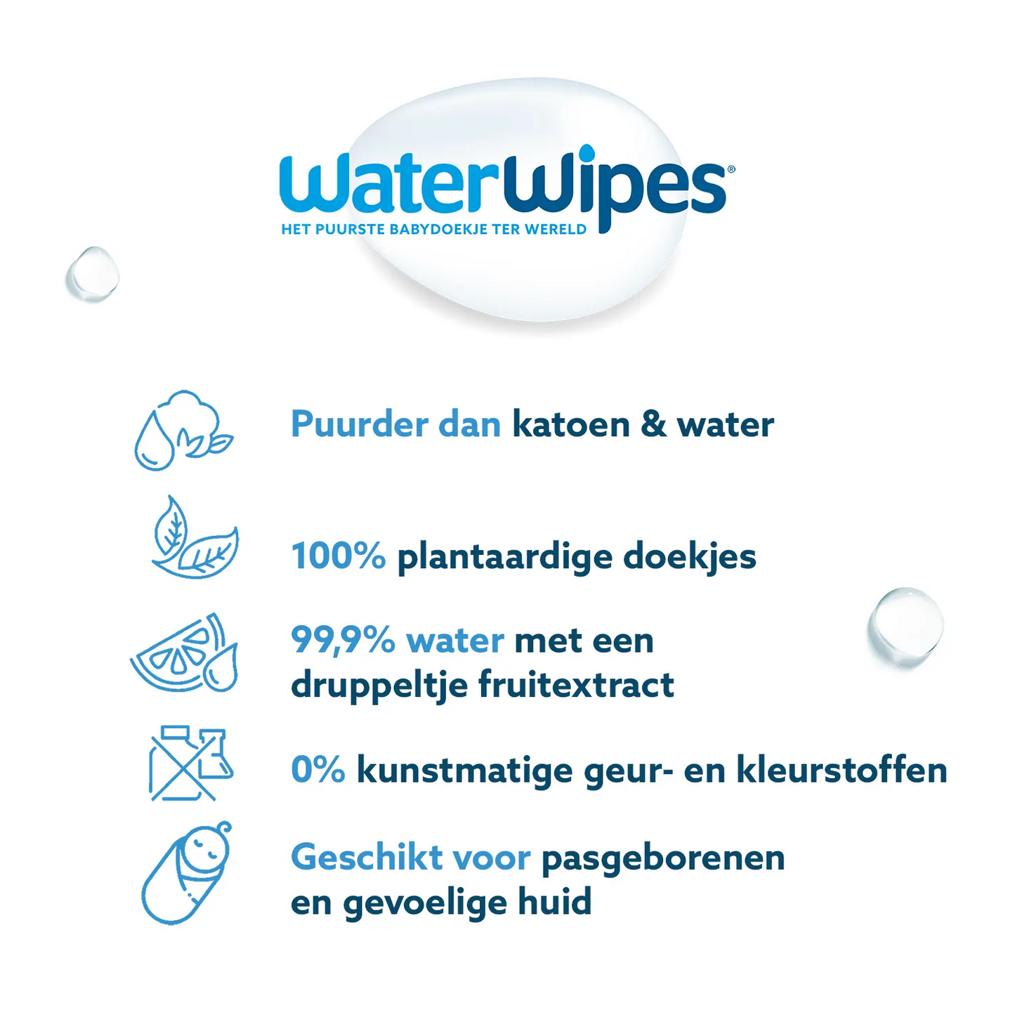 WaterWipes are the only baby wipes that contain only 99.9% water and a drop of fruit extract, and are plastic-free. We're therefore the most recommended baby wipe brand by maternity nurses in the Netherlands. Still just as pure and gentle on even the most sensitive skin, but now kinder to the environment. To learn more about WaterWipes, visit our website www.waterwipes.nl.
